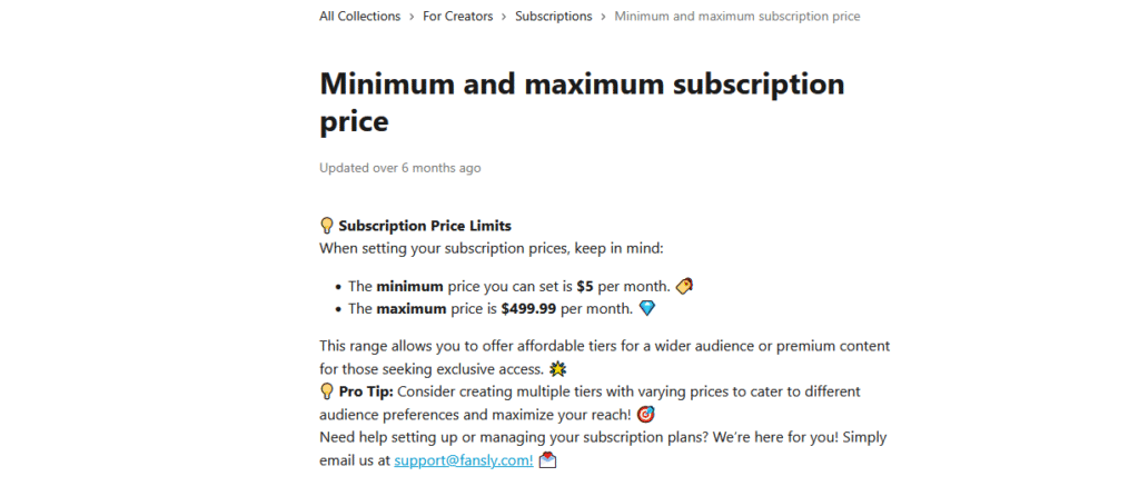Если на OnlyFans существует ограничение $49.99 в месяц за подписку, то на Fansly такого ограничения нет, можно ставить от $4.99 до $499.99 в месяц. У вас на странице может быть, например, 3 тира: 5$, 50$, 500$ с различными бонусами для подписчиков.